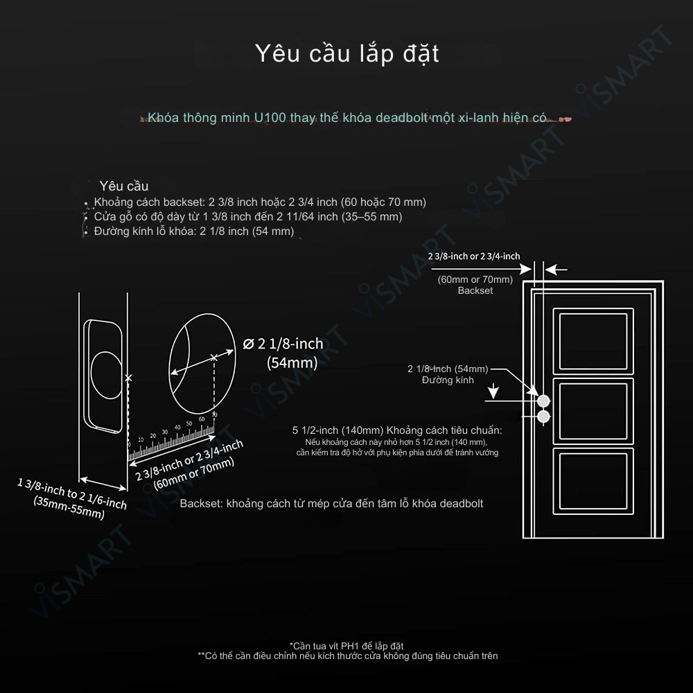Độ cửa: Rộng tối thiểu 90mm (Khóa U50 được thiết kế để người dùng có thể tự lắp đặt, tuy nhiên nếu không tự tin, bạn nên nhờ đến thợ khóa chuyên nghiệp).